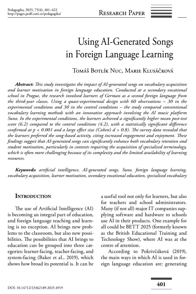 - Naši vyučující Tomáš Botlík Nuc a Marie Klusáčková publikovali svůj výzkum v prestižním českém vědeckém časopise Pedagogika. Ve svém příspěvku se věnovali využití tvorbě písní pomocí AI ve výuce odborného cizího jazyka. Článek si můžete přečíst Využití písní generovaných umělou inteligencí ve výuce cizích jazyků.