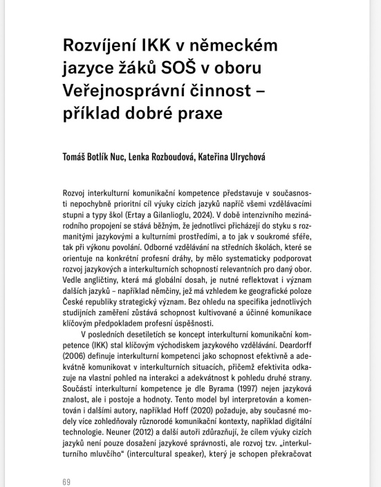a Kateřina Ulrychová jsou autoři odborného článku publikovaného ve sborníku z vědecké konference. Ve svém příspěvku se věnují Rozvíjení interkulturní komunikační kompetence v německém jazyce žáků SOŠ v oboru Veřejnosprávní činnost – příklad dobré praxe  a popisují, jak naše škola přistupuje k zahraničním odborným praxím v Německu.